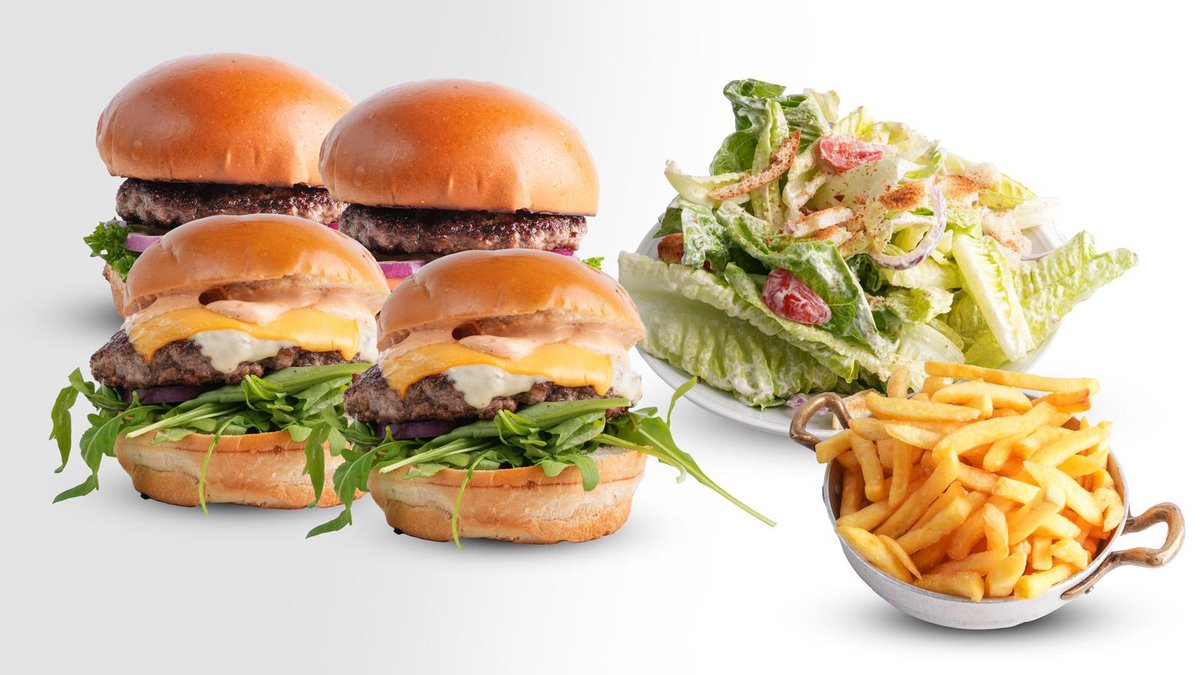 2 צ'יז בורגר, 2 סמאש בורגר, סלט קיסר, קריספי ציפס וטבעות בצל גדול