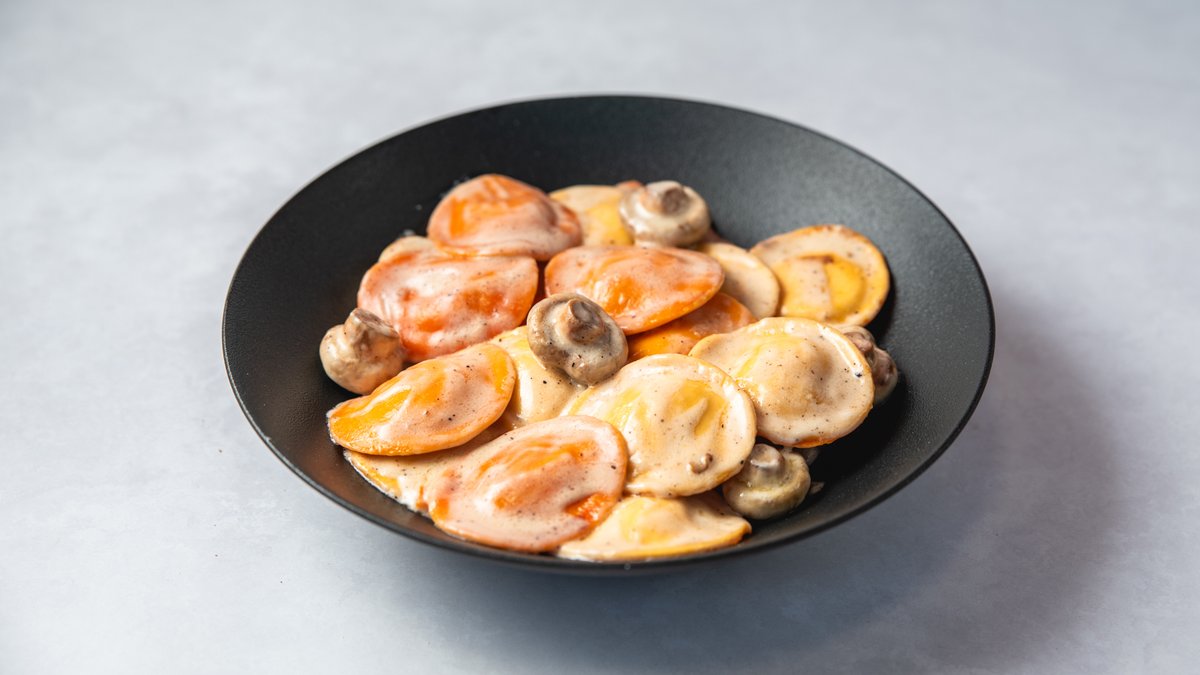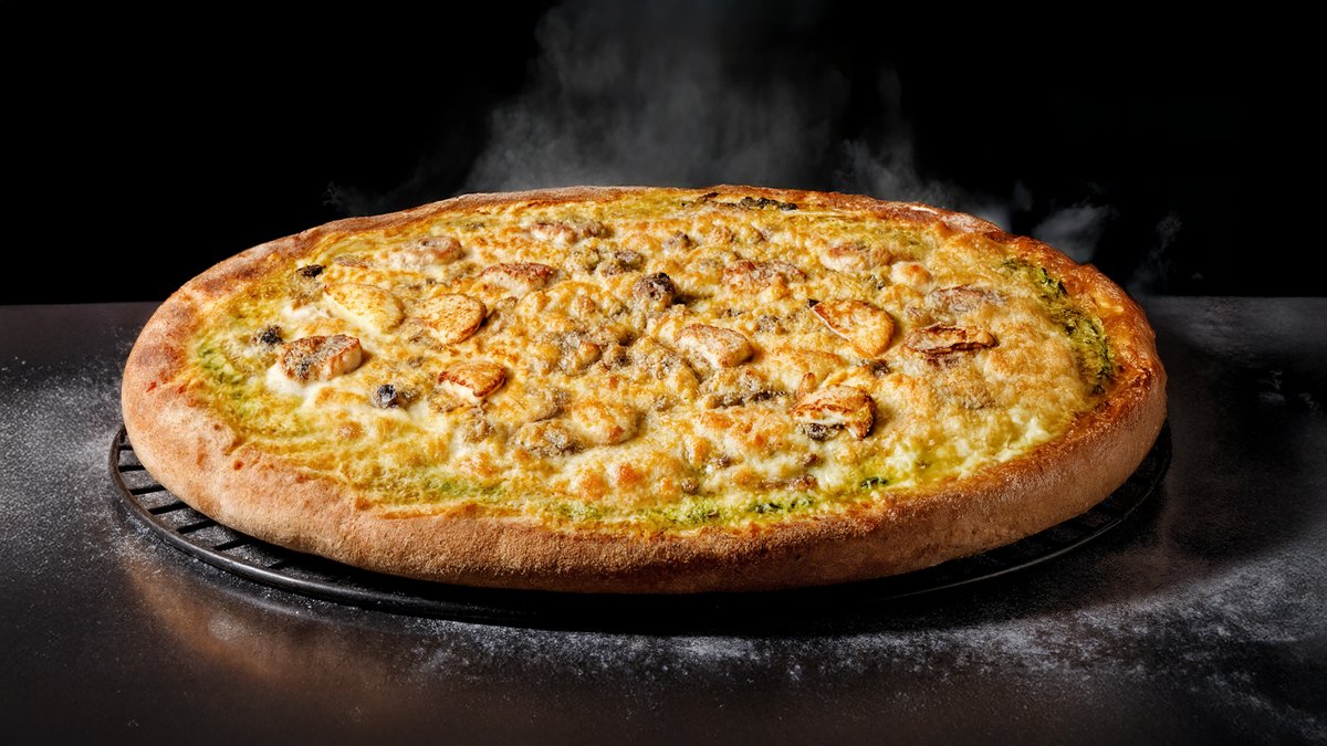 בצק סטנדרט, רוטב שמנת פסטו, פטריות מוקפצות, גבינת עיזים, גבינת פרמז'ן