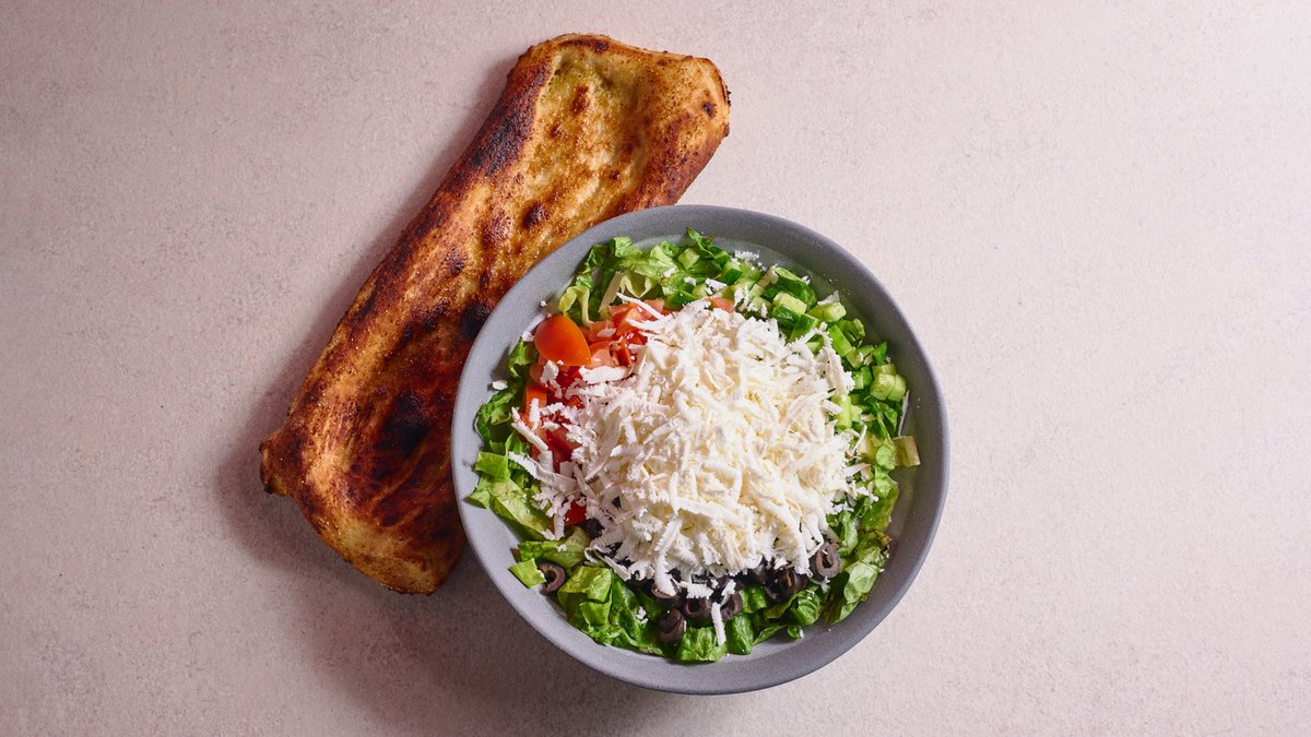 חסה, עגבניה, מלפפון, זיתים שחורים, גבינה בולגרית | מוגש עם פוקאצ׳ה לבחירה