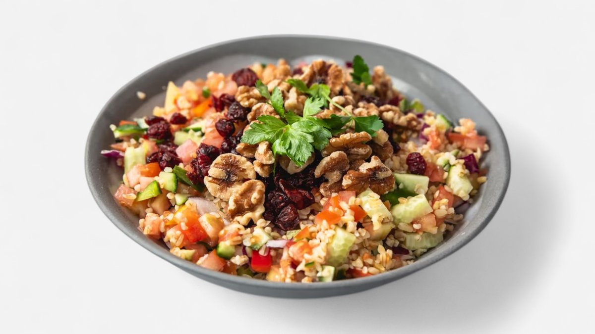 בורגול, עגבניה, מלפפון, פלפלים צבעוניים, בצל סגול, פטרוזיליה, אגוזים, חמוציות