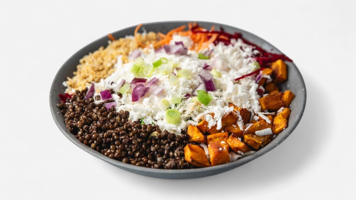 בורגול, עדשים שחורות, סלק, גזר, בצל ירוק, בצל סגול, פטרוזיליה, קוביות בטטה אפוייה, גבינה בולגרית