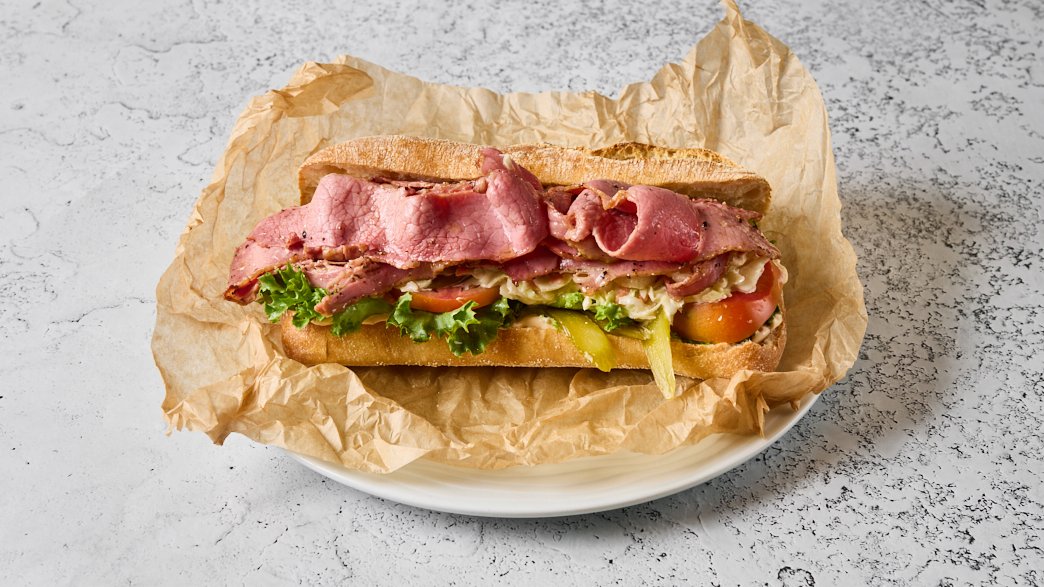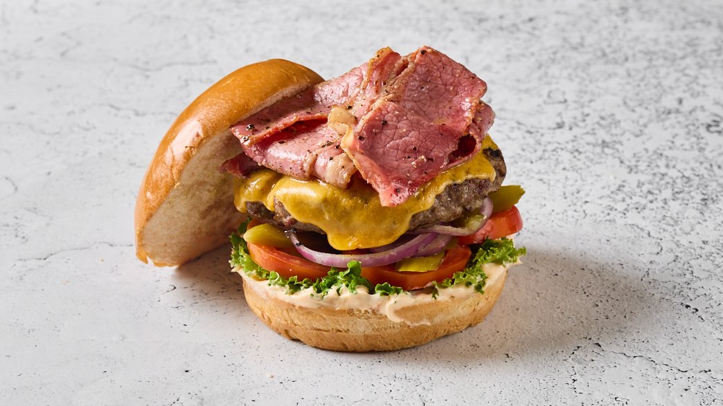 220 גרם קציצת בקר בלחמנייה עם חסה לאליק, עגבנייה, מלפפון חמוץ, בצל פריך, קורנביף, וגבינת צ'דר אנגלית