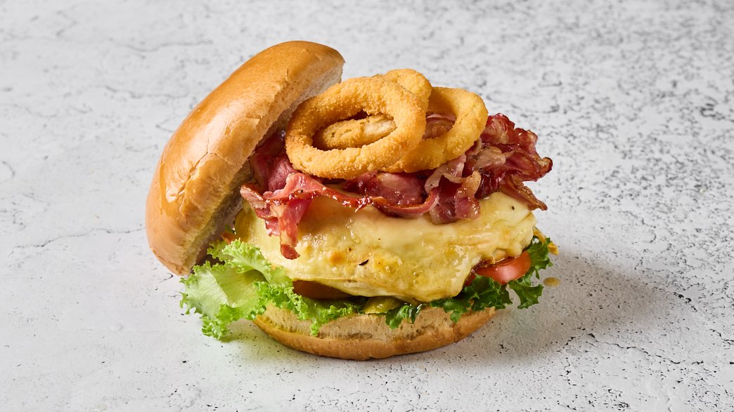 220 גרם קציצת בקר בלחמנייה עם חסה לאליק, עגבנייה, מלפפון חמוץ, גבינת אמנטל, בייקון טלה וטבעות בצל