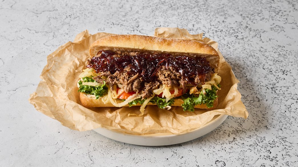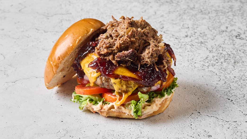 220 גרם קציצת בקר בלחמנייה עם חסה לאליק, עגבנייה, מלפפון חמוץ, בצל סגול, בשר אסאדו מפורק, צ'דר וריבת בצל