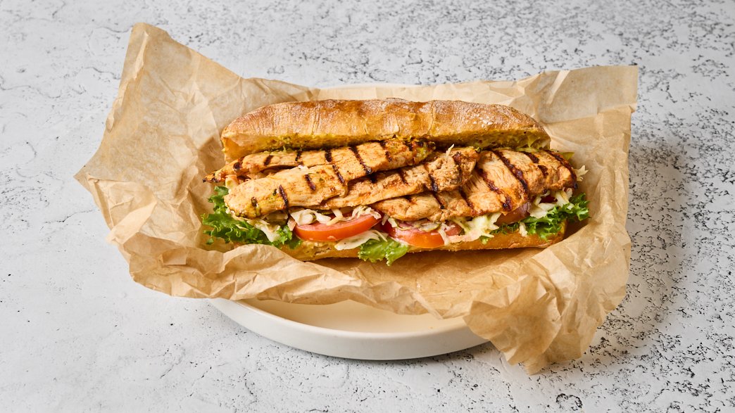 חזה עוף במרינדה על הגריל, איולי קארי, חסה לאליק, עגבנייה, מלפפון חמוץ וסלט קולסלאו