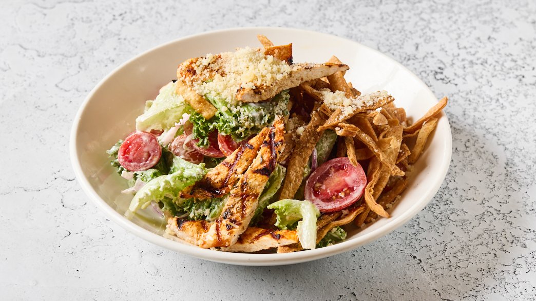 איולי צ'יפוטלה ורוטב קיסר, חסה לאליק, עגבנייה, מלפפון חמוץ, בצל פריך וסלט קולסלאו