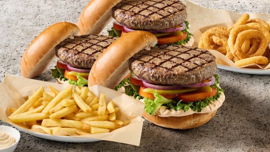 110 גרם קציצת בקר בלחמנייה עם חסה לאליק, עגבנייה, מלפפון חמוץ, מוגש עם צ׳יפס ושתייה לבחירה