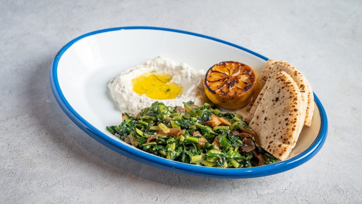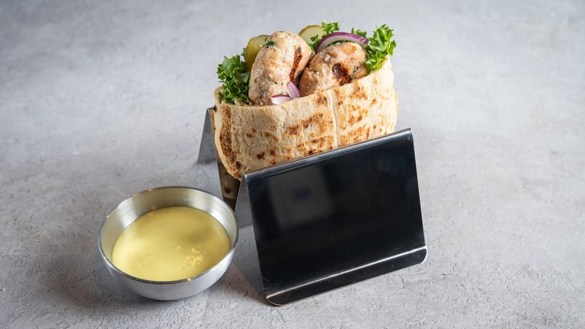 תבשיל עולש בר עם בצל מקורמל, ציזיקי ושמן זית בפיתה עם ציזיקי, עגבניה, מלפפון חמוץ וחסה