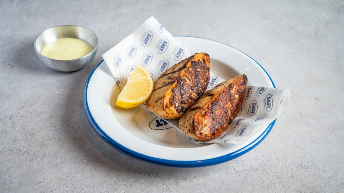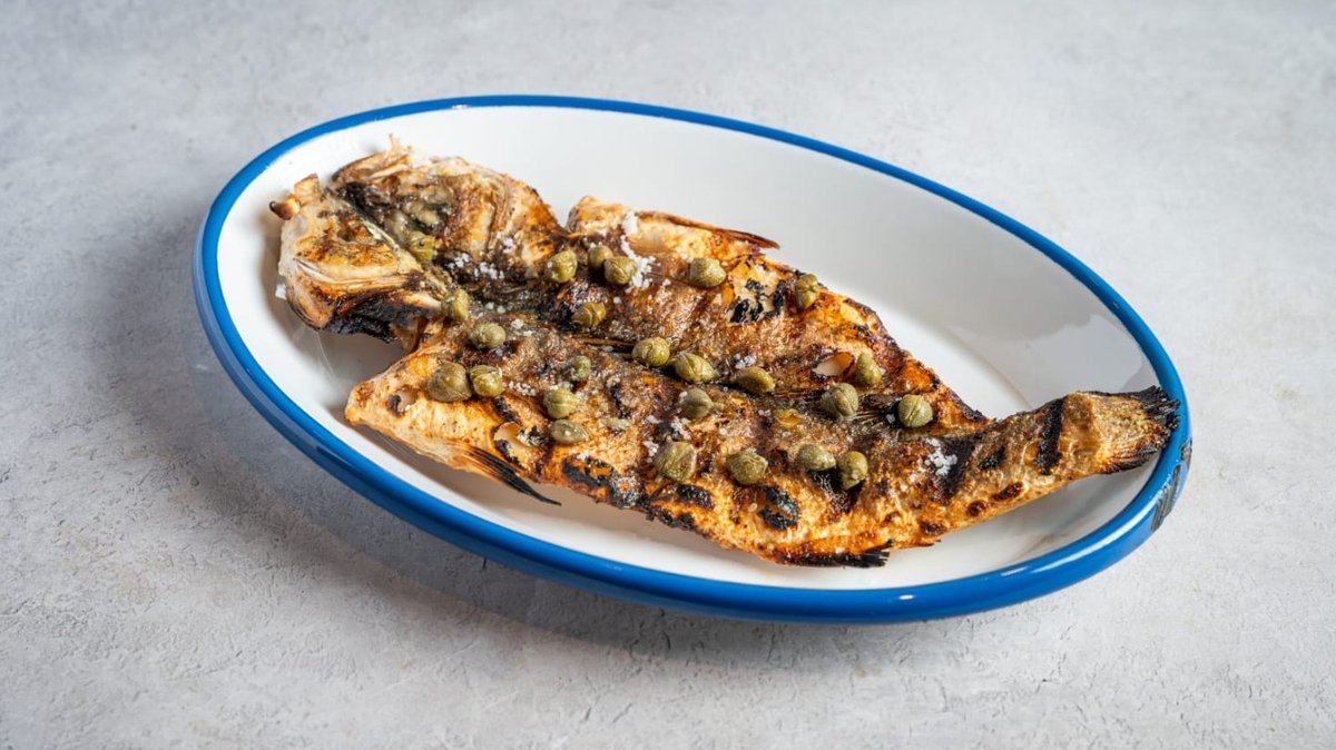 דג שלם עם עצמות, פתוח באמצע וצלוי בג׳וספר מוגש עם תוספת לבחירה