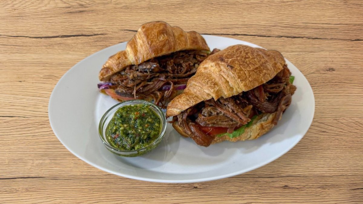 2 קרואסוני אסאדו עם ירקות, מוגש לצד רוטב צ׳ימיצ׳ורי