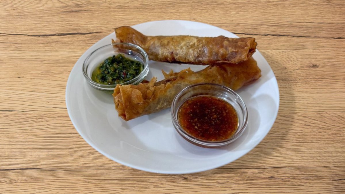 2 סיגרים ממולאים בשר מוגש לצד צ׳ימיצ׳ורי וצ׳ילי כוסברה