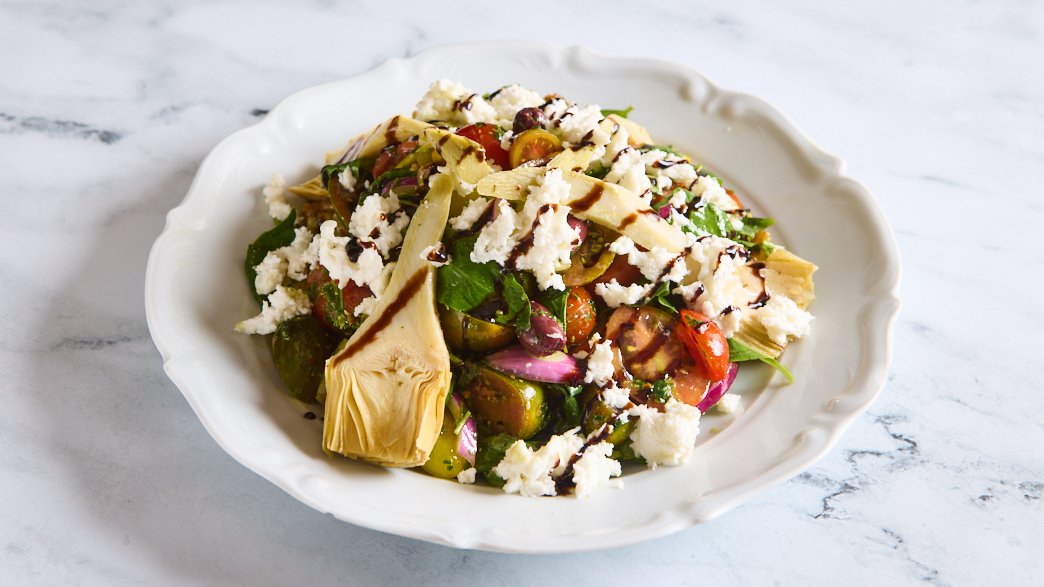 מיקס עגבניות שרי צבעוניות, ארטישוק צלוי בגריל, זיתי קלמטה וקרעי מוצרלה