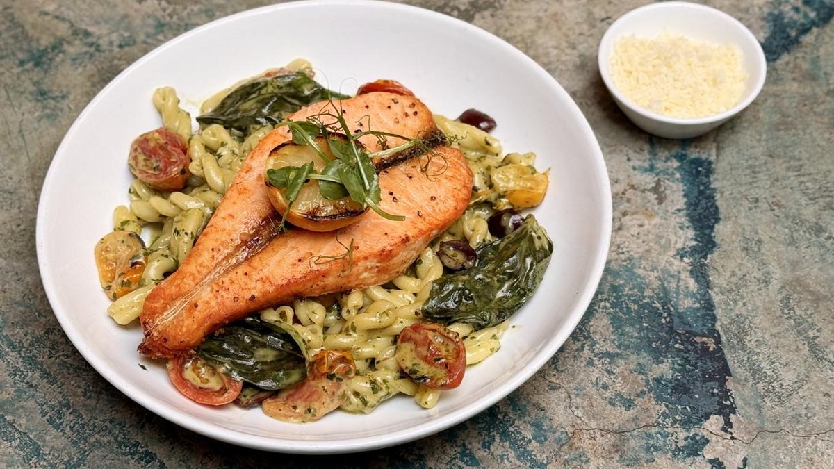 סלמון אפוי בטאבון על מצע של פסטה פוזילי, שמנת בזיליקום, עגבניות שרי קונפי וזיתי קלמטה.