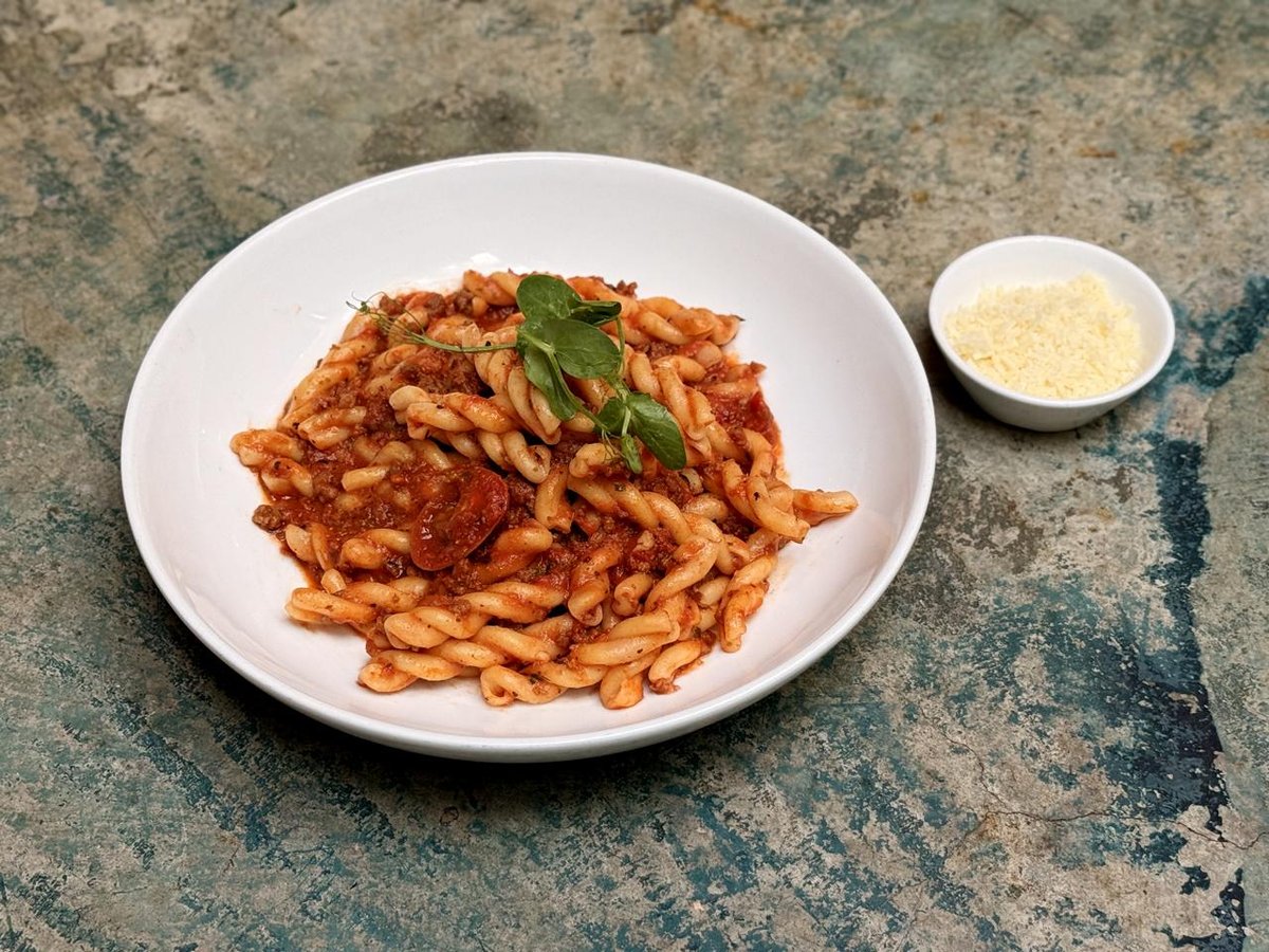 דפי פסטה בעבודת יד, בשר ראגו, רוטב רוזה וגבינת פרמז׳ן