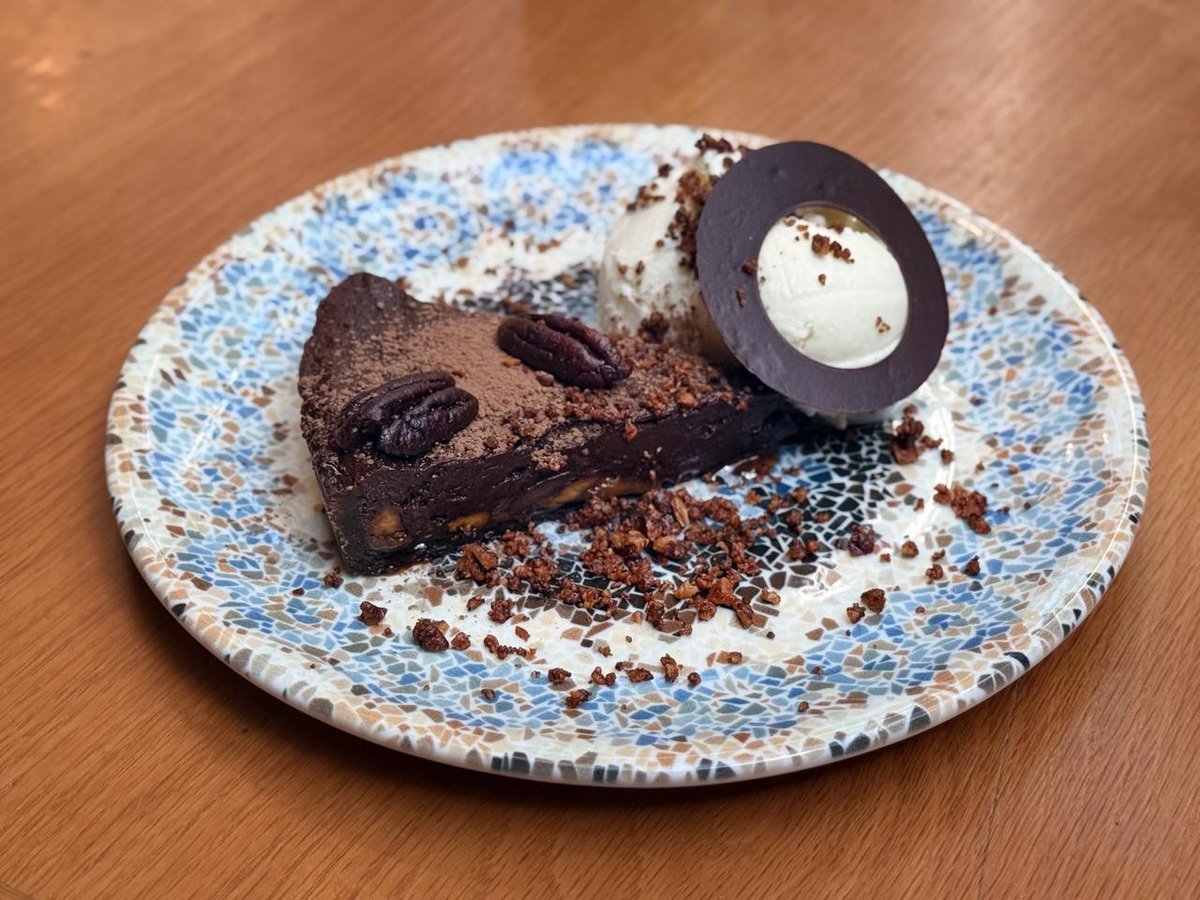 עוגת שוקולד חמה עם קרם קרמל ואגוזי פקאן, מוגש עם כדור גלידת וניל