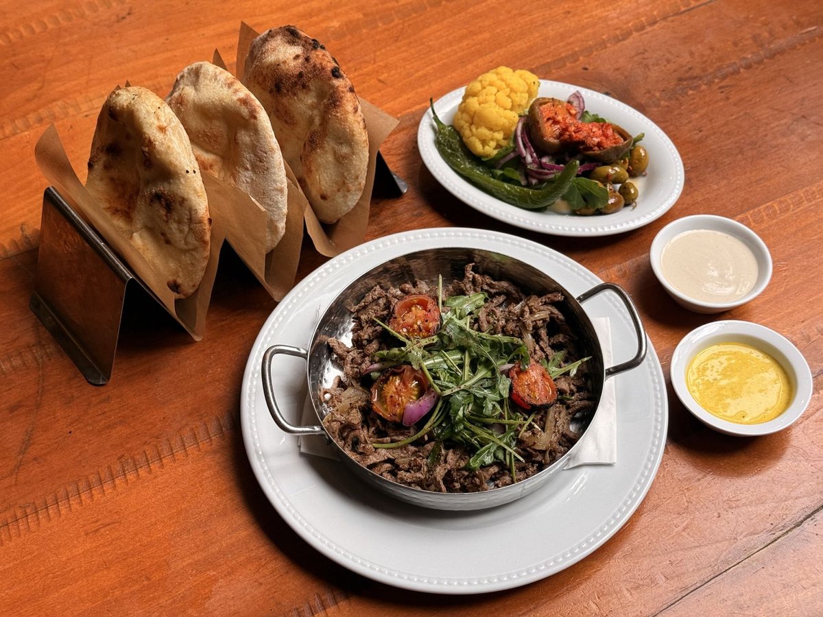 מגש שווארמה עגל, עם לחם מהטאבון, טחינה, עמבה עלים ירוקים וחמוצים.