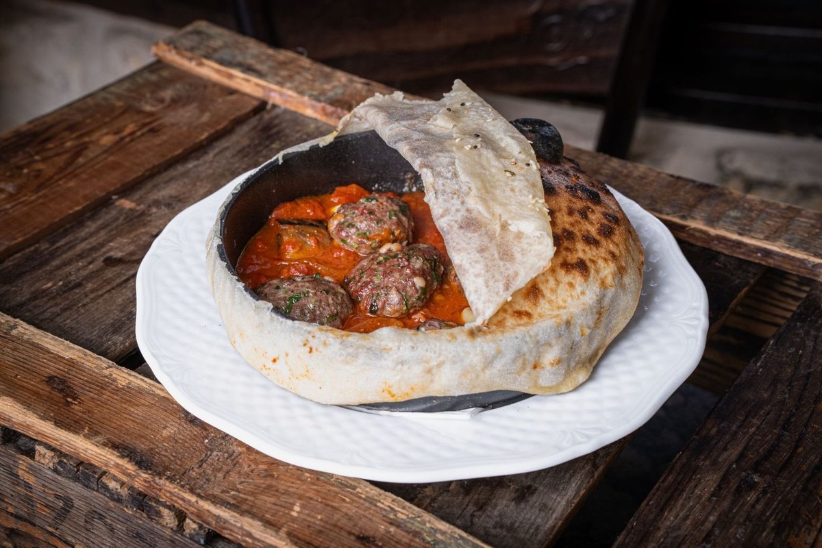 עם טחינה מקומית וגרגירי חומוס, מוגש עם לחם מהטאבון
