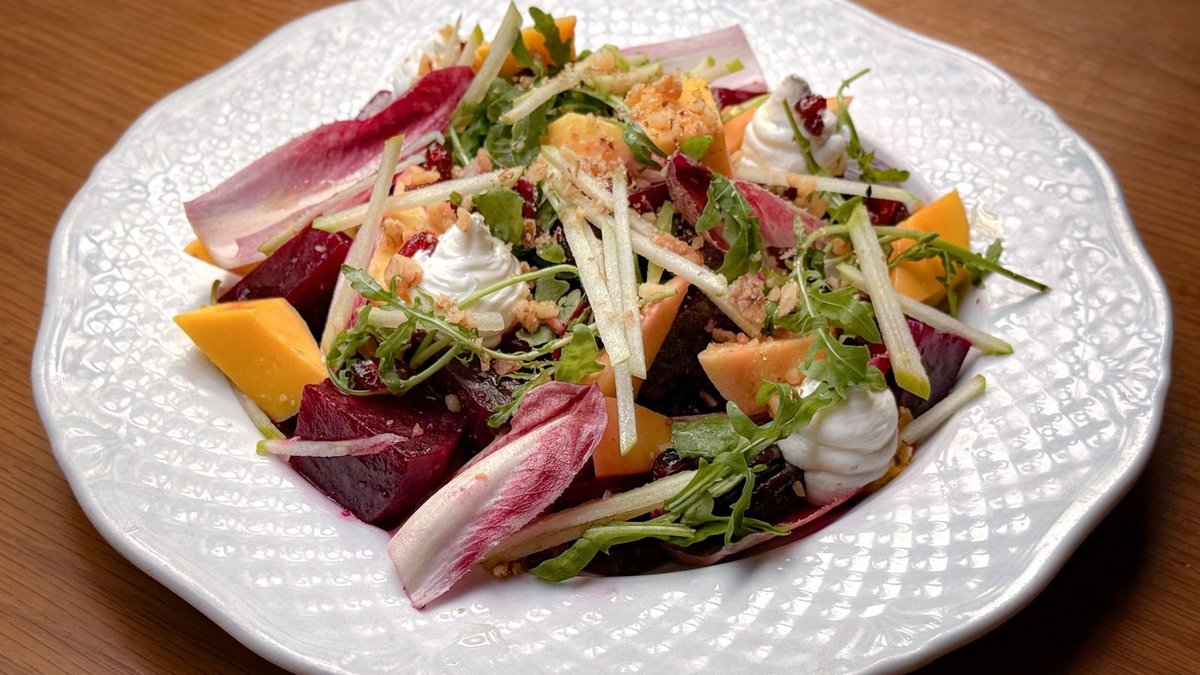 קוביות סלק, תפוחים, חסה אנדיב, עלי רוקט, מנגו, פקאן סיני, אגוזי מלך, לאבנה ברוטב ויניגרט הדרים