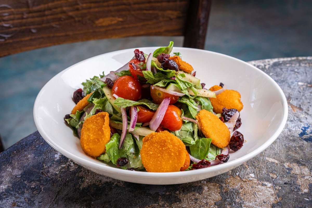עלים ירוקים עונתיים, עגבניות שרי, בצל, תפוחים, פירות יבשים וגבינת עיזים מטוגנת
