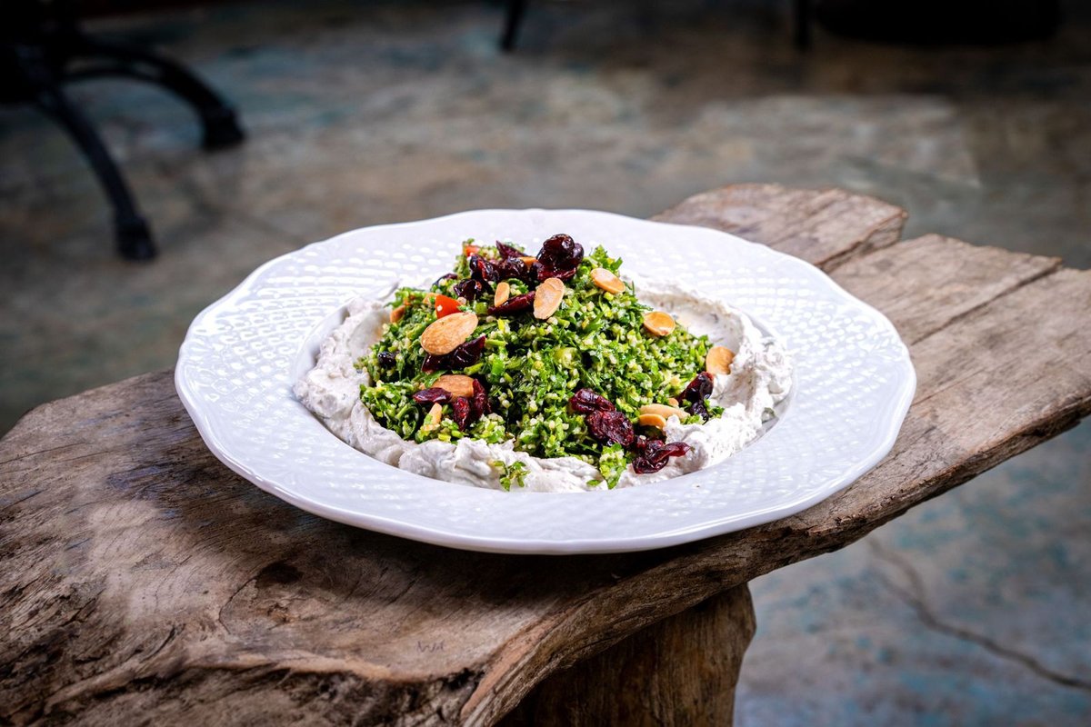 פטרוזיליה קצוצה, נענע, בצל ירוק, שמן זית ולימון, על מצע לבנה מתובלת עם חמוציות ושקדים