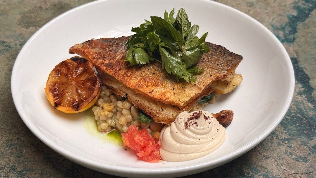 פילה בר ים על מצע תבשיל מפתול, גרגירי חומוס ותרד.