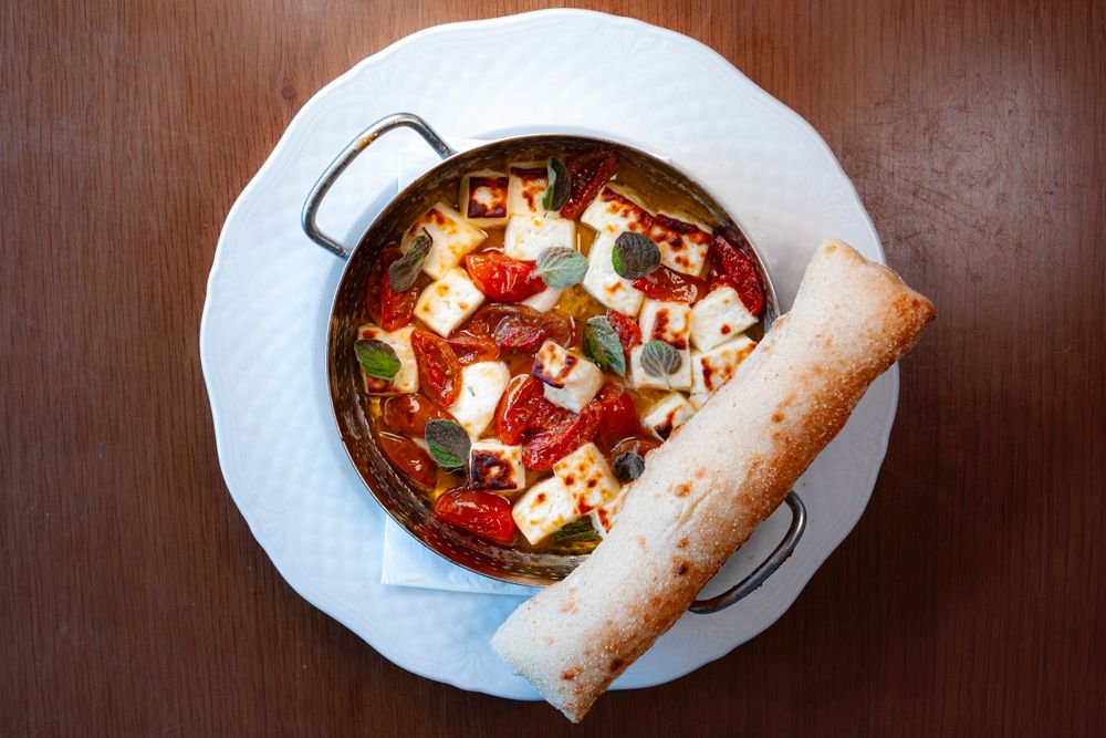 בשר בקר נא, שמן זית, בלסמי מצומצם, גבעולי ארטישוק, גבינת פרמז׳ן ונגיעות קרם חציל שחור מוגש עם מקל לחם מהטאבון