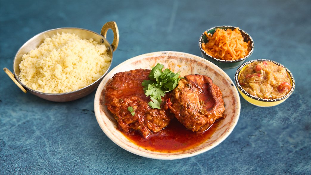 כרע עוף מבושל בבישול ארוך עם תפוח אדמה, עגבנייה וזעתר מוגש עם לחם, תוספת וסלטים לבחירה