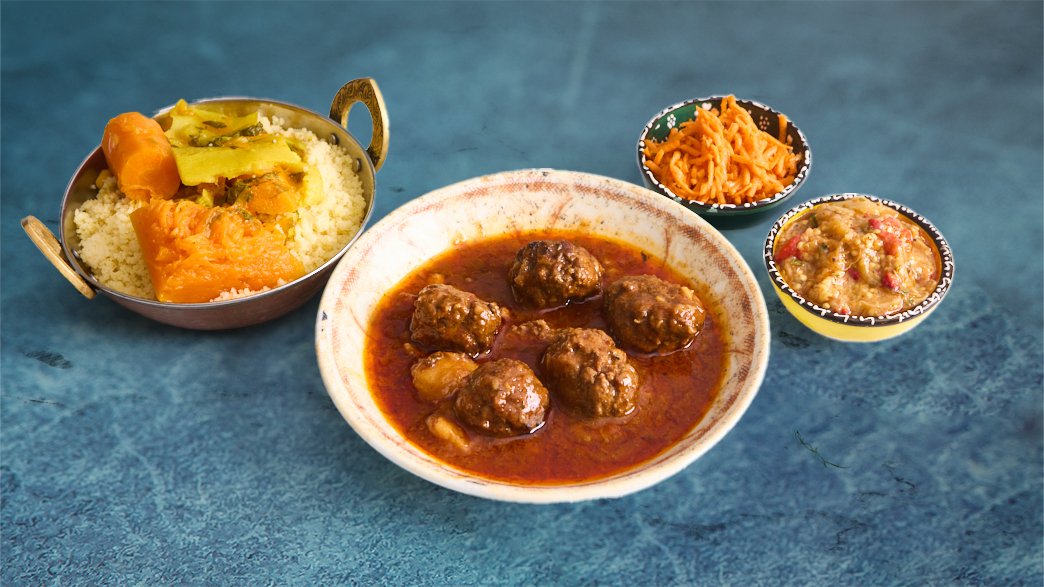 פרוסות תפו"א מחבקות קציצה ברוטב אדום עדין | מוגש עם קוסקוס, שני סלטונים לבחירה ולחם