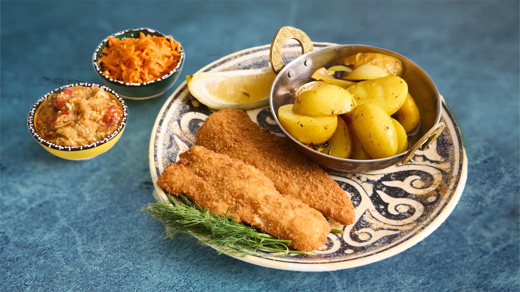 שניצל דג לבן עם רוטב איולי חריימה ולימון מוגש עם לחם, צ׳יפס וסלטים לבחירה