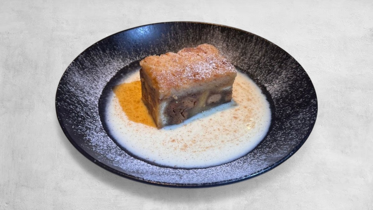 ברד פודינג, קינמון, שקדים ורוטב אנגלז שוקולד לבן