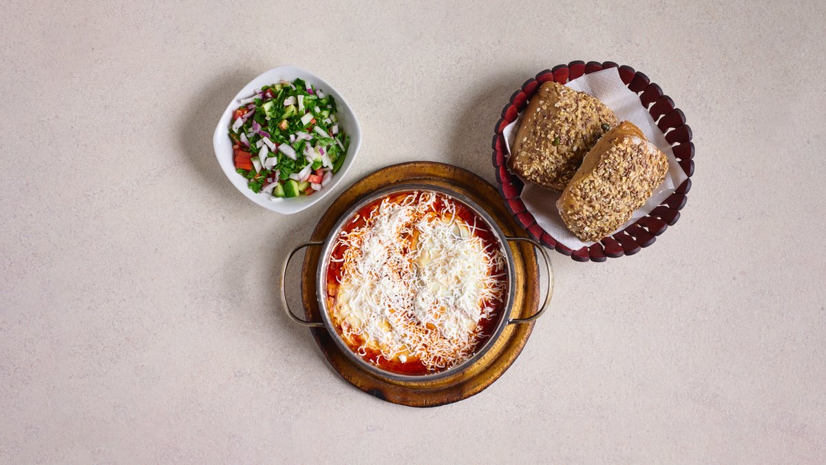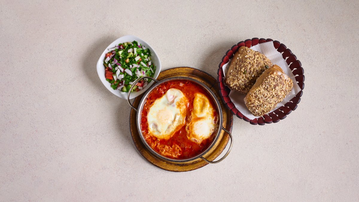 שקשוקה הנעשית במקום, 2 ביצים, סלט ירקות קצוץ אישי (עגבנייה, מלפפון, חסה, פטרוזיליה ובצל סגול) ולחם