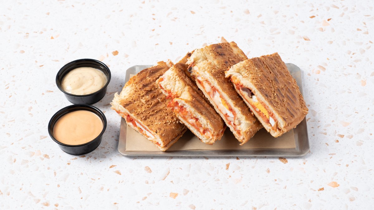 איולי, בצל סגול, נתחי טונה רוסטביף, צ'ילי, עגבנייה ורוקט בבגטון כוסמין