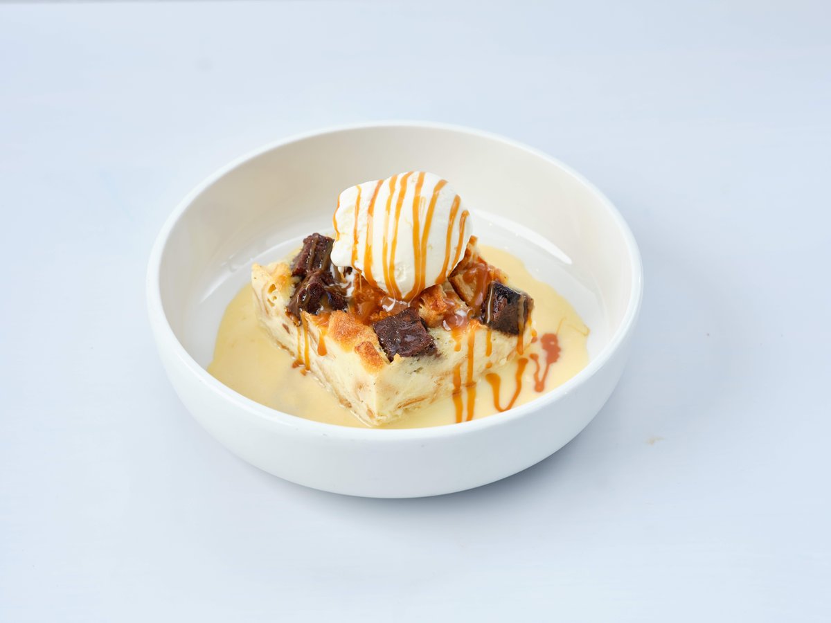 קרעי קרואסון חמאה ובראוניז שוקולד עשיר, טבולים בקרם ברולה צרפתי, רוטב אנגלז ורוטב קרמל מלוח מומלץ לחמם לכמה שניות לפני ההגשה.