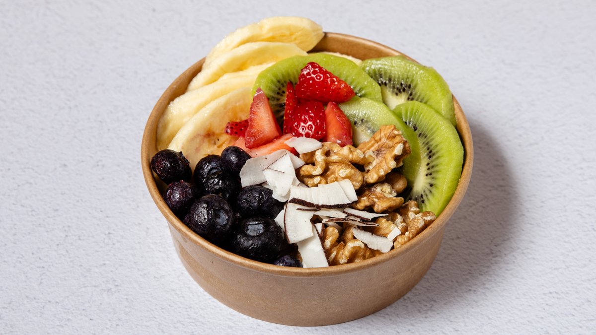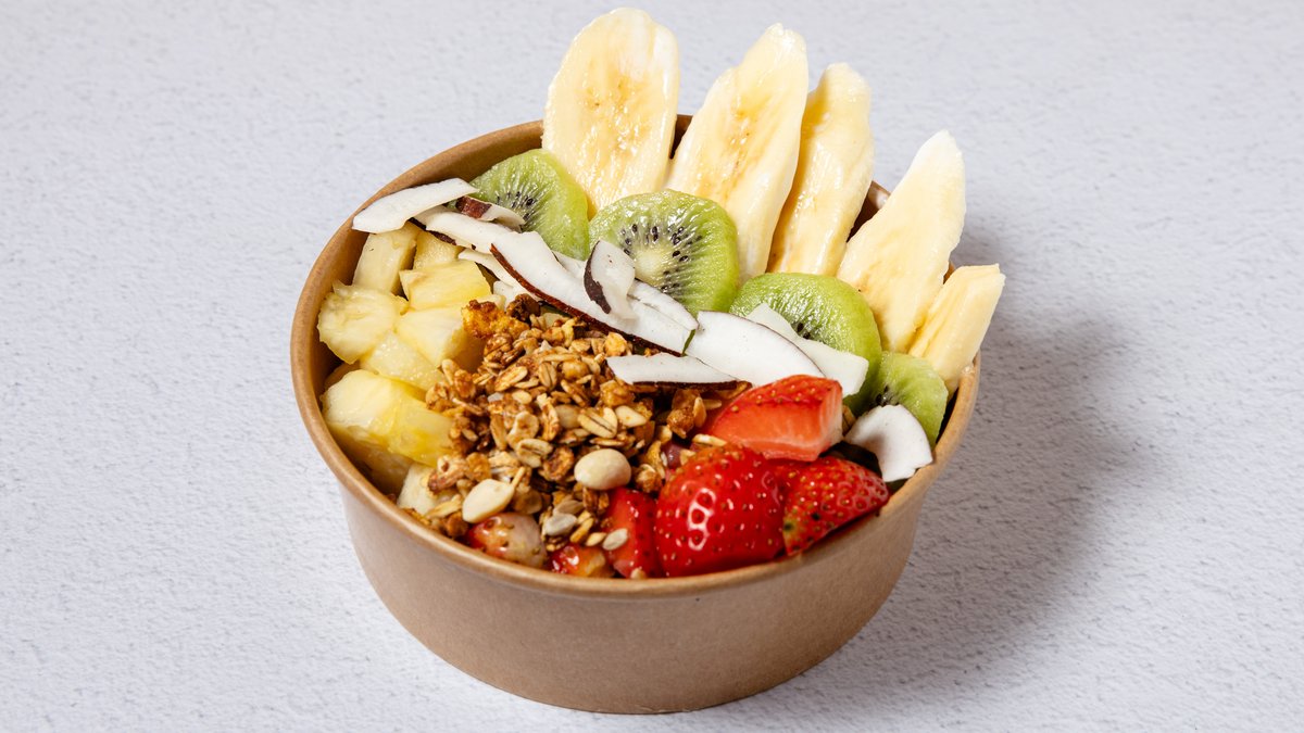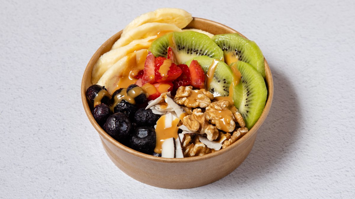 קערת אסאי ויוגורט חצי חצי מוגשת עם 5 תוספות לבחירה ו-2 רטבים לבחירה