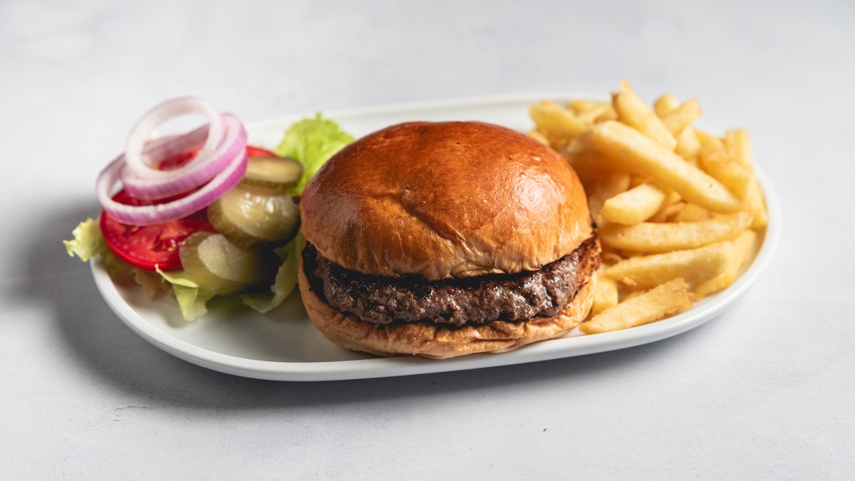 המבורגר 250 גר׳(לפני צלייה) בלחמניית בריוש מגיע בצד (חסה עגבניה ובצל) ומוגש עם תוספת לבחירה
