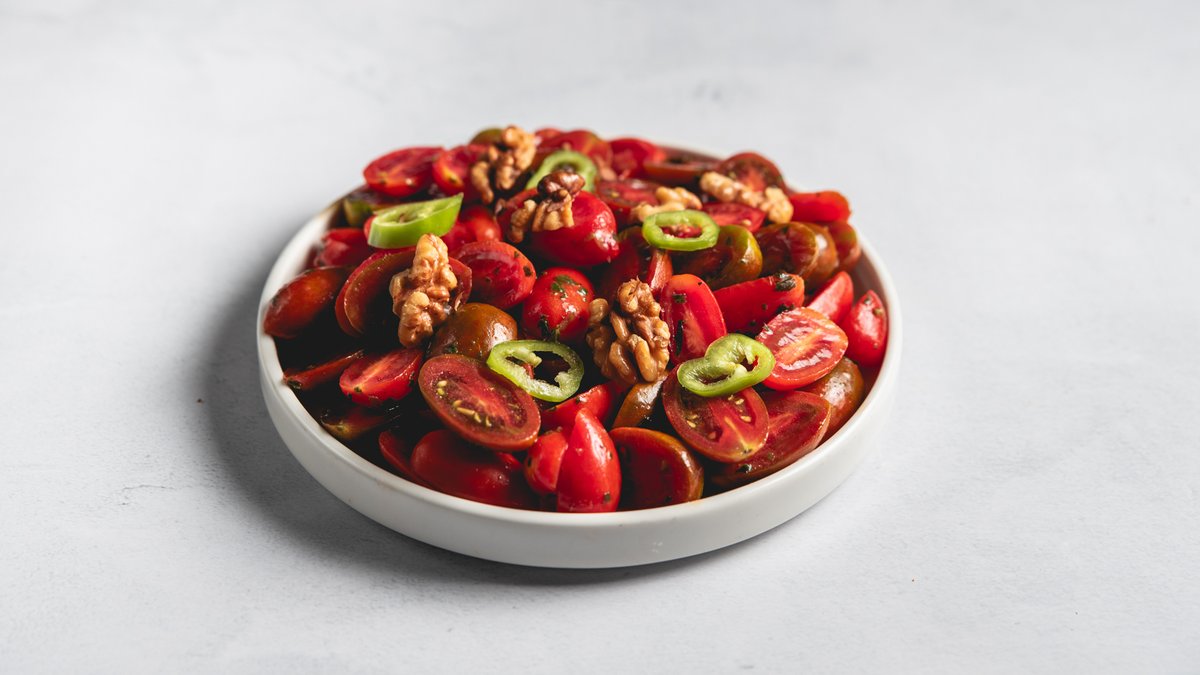סלט עגבניות קיץ , שמן בזיליקום פלפל חריף טרי מלח אטלנטי ואגוז מלך קלוי