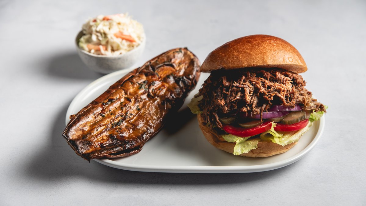 כריך בריסקט מעושן ומפורק בלחמניית בריוש מוגש עם תוספת חמה