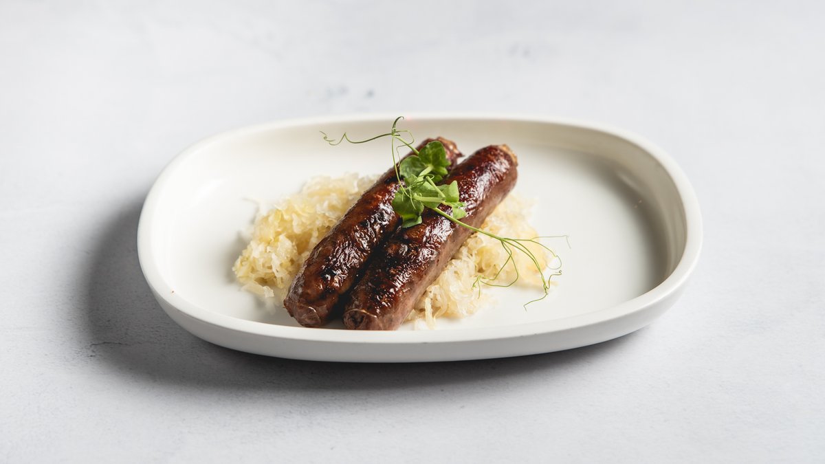 שתי נקניקיות צ׳וריסוס על מצע של כרוב כבוש מעושן
