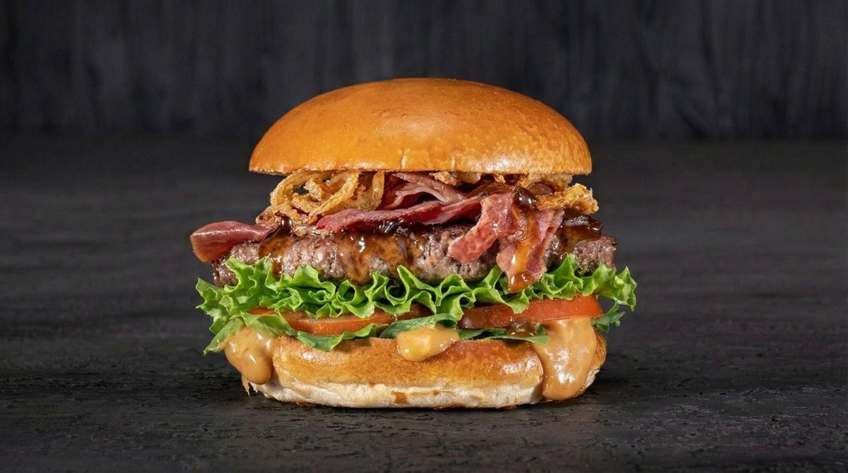 2 קציצות במשקל 110 גרם כל אחת מעוכות על הפלנצה עם בצל סגול צרוב, 2 פרוסות גבינה טבעונית, ריבת בצל, חמוצים ועגבניה