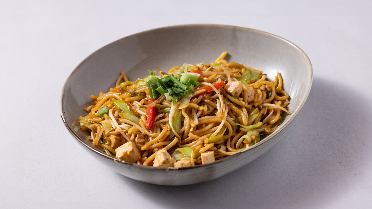 אטריות ביצים עם נתחי סינטהבקר, 3 סוגי בצלים, קשיו, נבטים, צ'ילי וכוסברה.