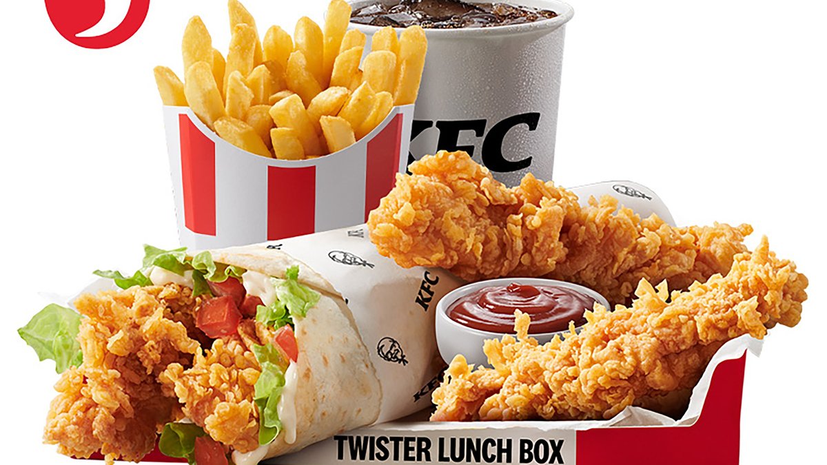 ארוחת לאנץ' בוקס טוויסטר הכוללת: טוויסטר חריף, צ'יפס גדול/ טבעות בצל, 2 יח' סטריפס חריף, כשתייה גדולה לבחירה ורוטב אחד לבחירה