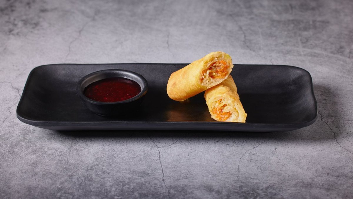 שתי יחידות של אגרול מטוגן ממולא בירקות, מוגש עם רוטב חמוץ מתוק