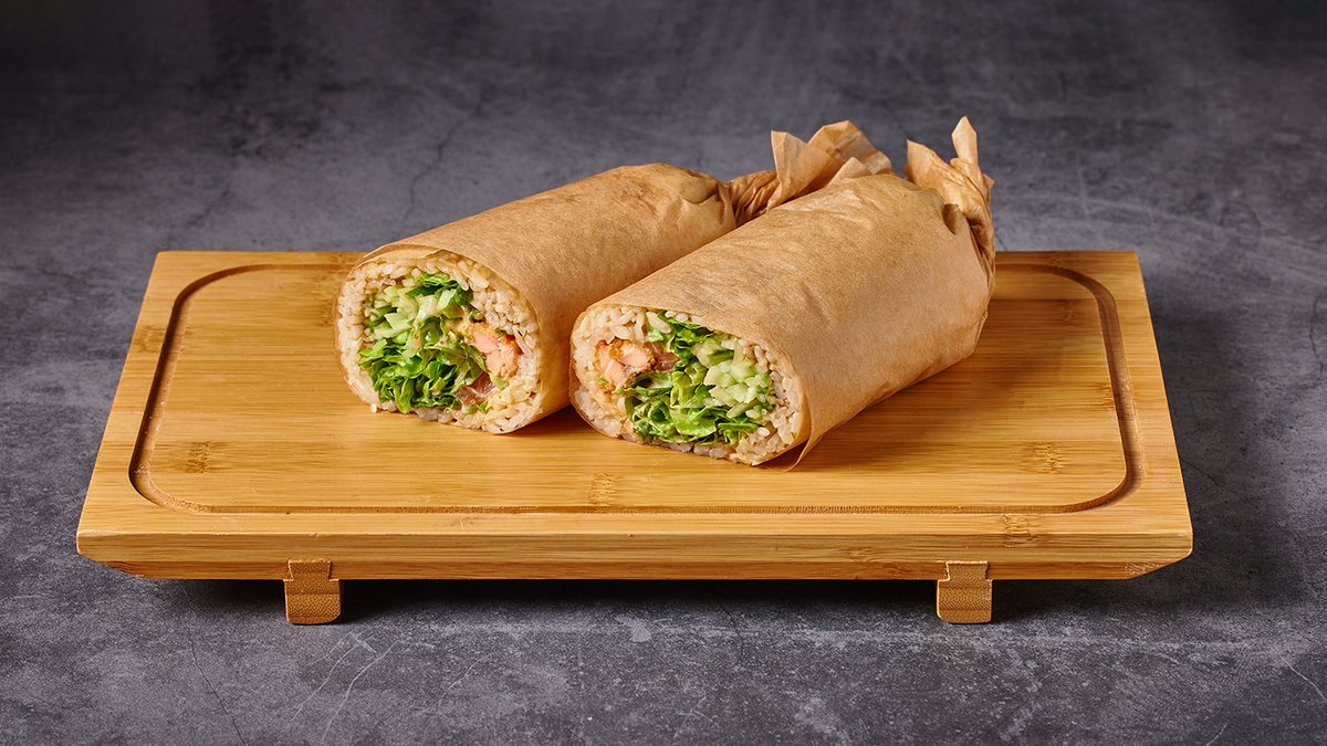 סלמון מטוגן, סלמון נא ברוטב פונזו, אבוקדו, מלפפון, בצל, חסה, ספייסי מיונז וטריאקי עטופים באורז סושי ודף אורז