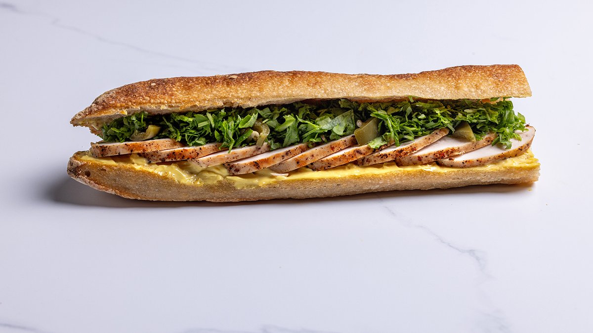 מיונז דיז’ון, גבינת עזים, רליש פלפלים עם צנובר ואוכמניות, עלי רוקט, בלחם מימי