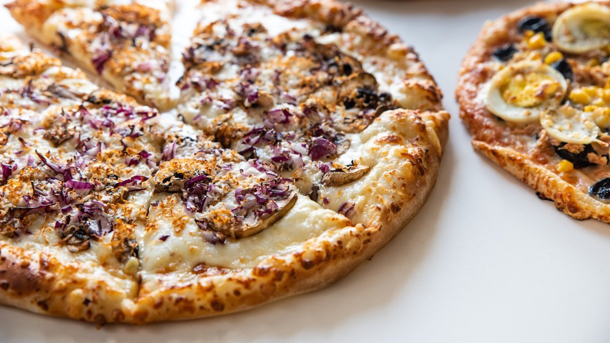 מלאווח פיצה עם בולגרית, טונה, פטריות, בצל וביצה קשה