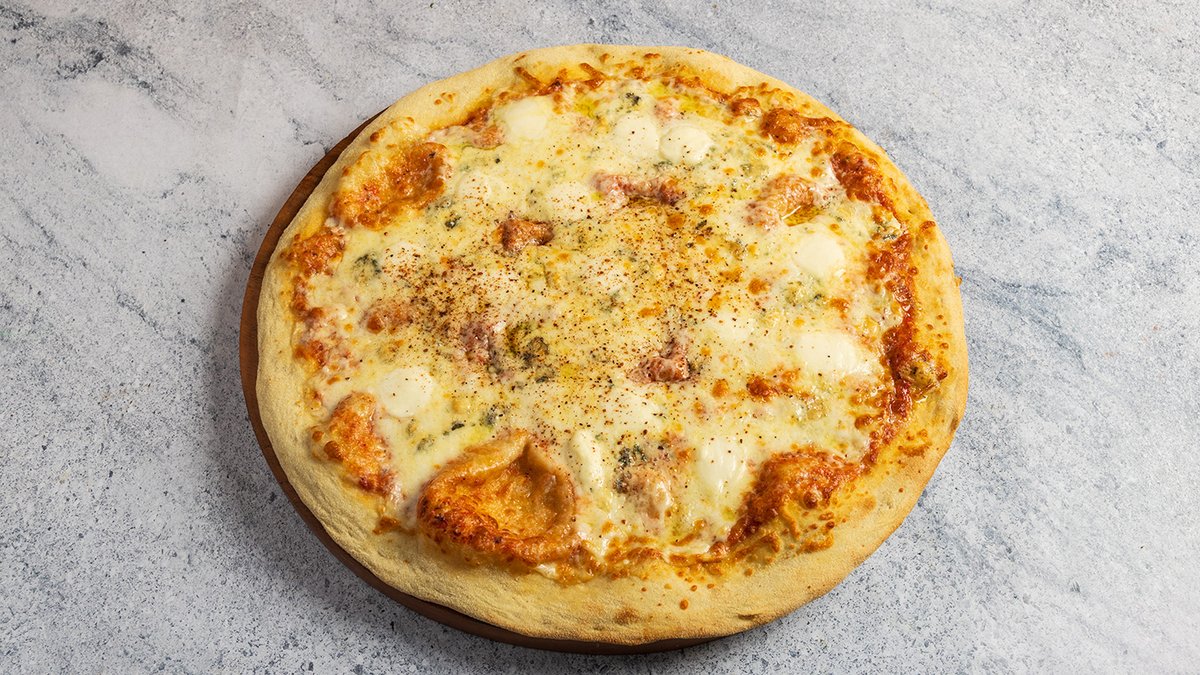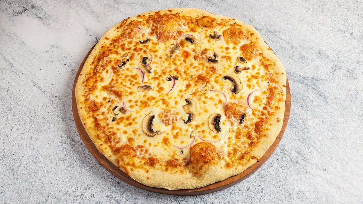 רוטב עגבניות, קרם כמהין, מוצרלה, פטריות פורצ׳יני ושמפיניון, בצל מקורמלר ופרמז׳ן מגורר
