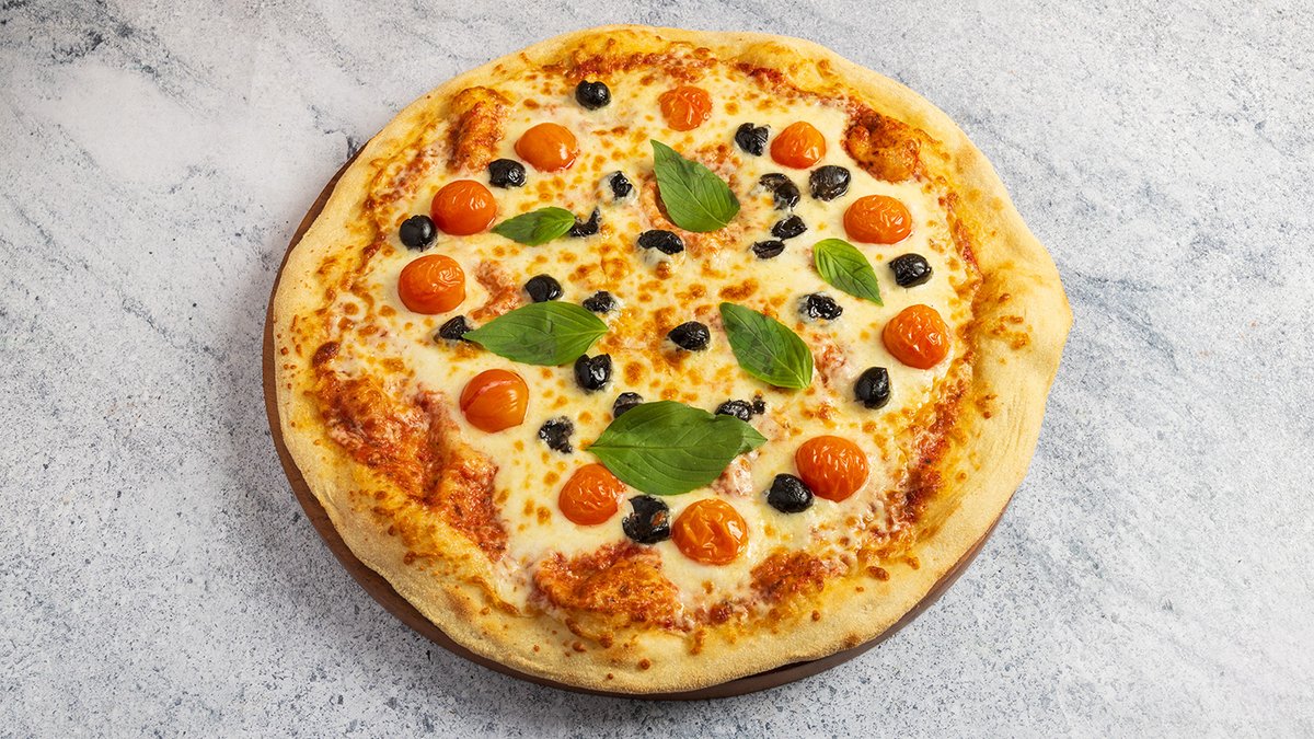 רוטב עגבניות איטלקי, גבינה מוצרלה, עגבניות שרי צלויות, זיתים שחורים ובזיליקום