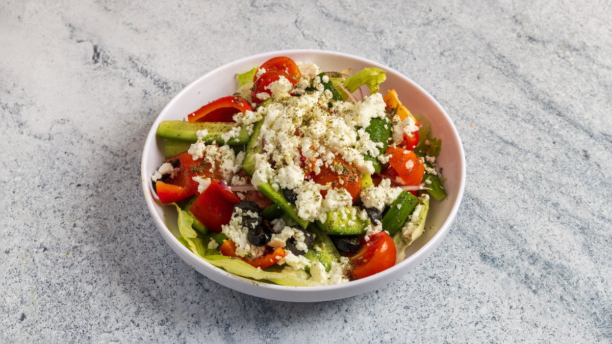 חסה, מלפפון בלדי, עגבניה, בצל שאלוט, פלפל אדום, זיתים מושחרים, גבינה פטה ,5%, תחמיץ לימון, שמן זית וזעתר