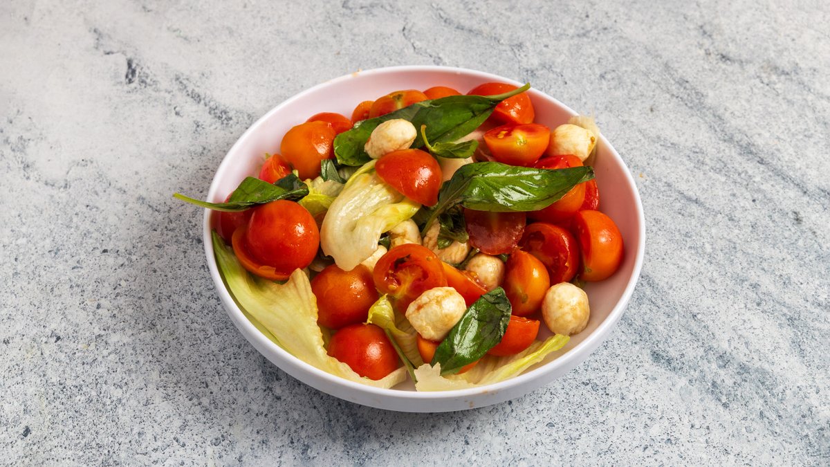 עגבניות שרי צבעונית, מוצרלה באפלו, עלי בזיליקום, בסלמי מצומצם ושמן זית כתית מעולה