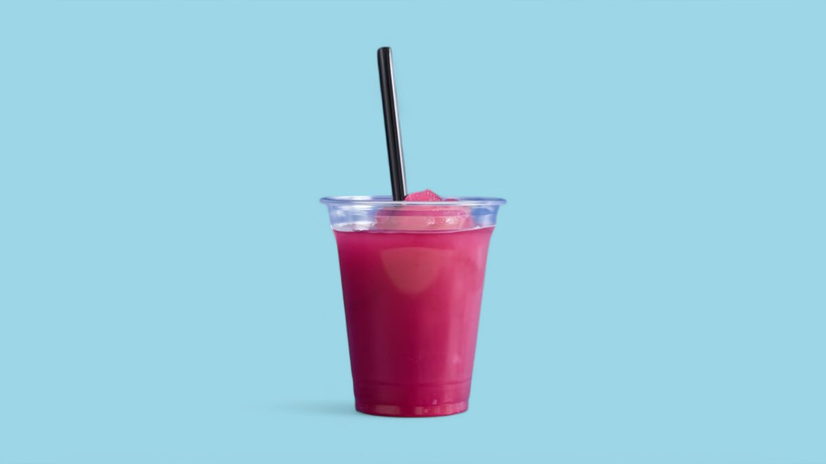 שייק על בסיס מיץ תפוחים עם תות, בננה, סורבה תות, ויוגורט